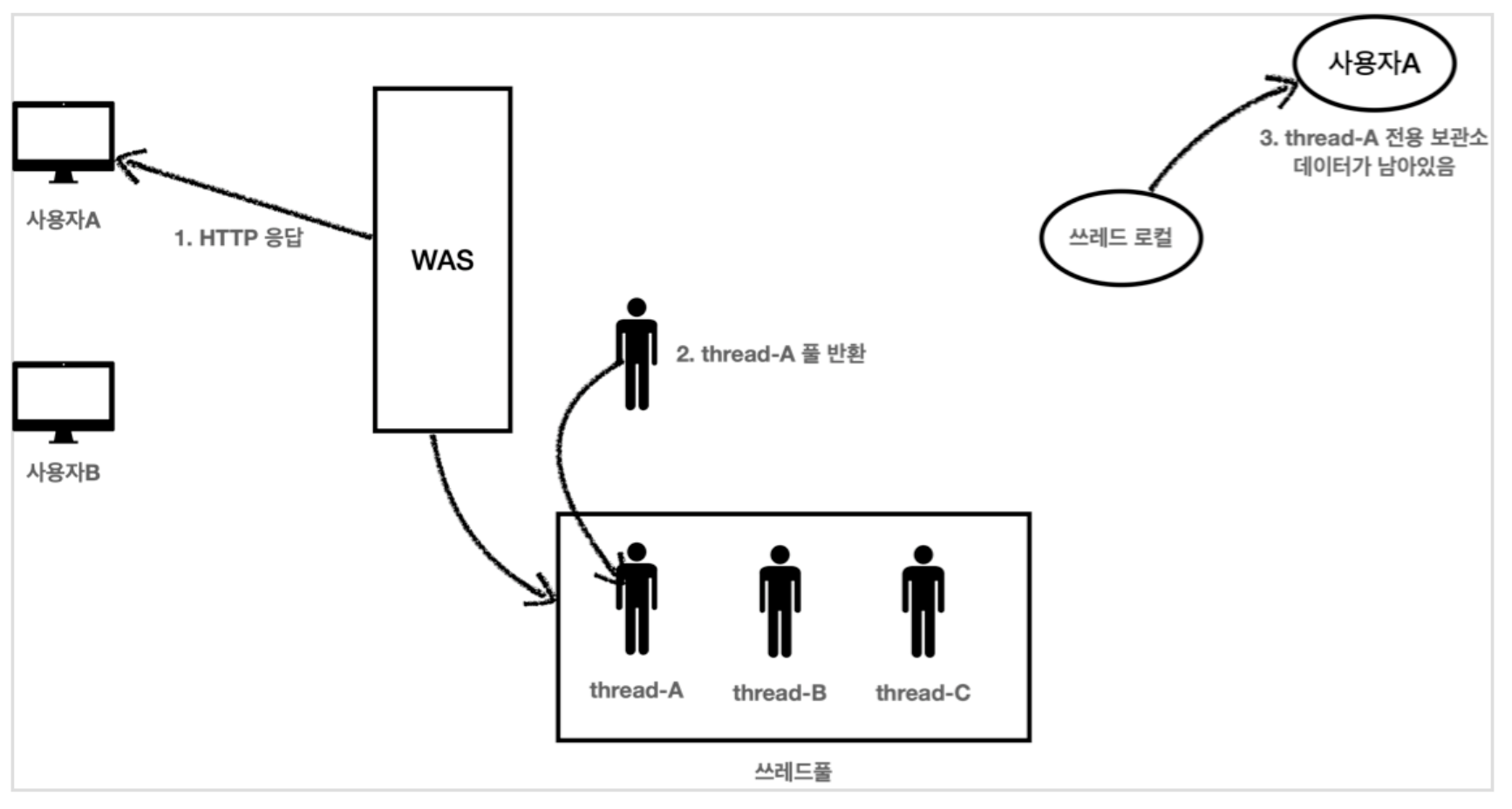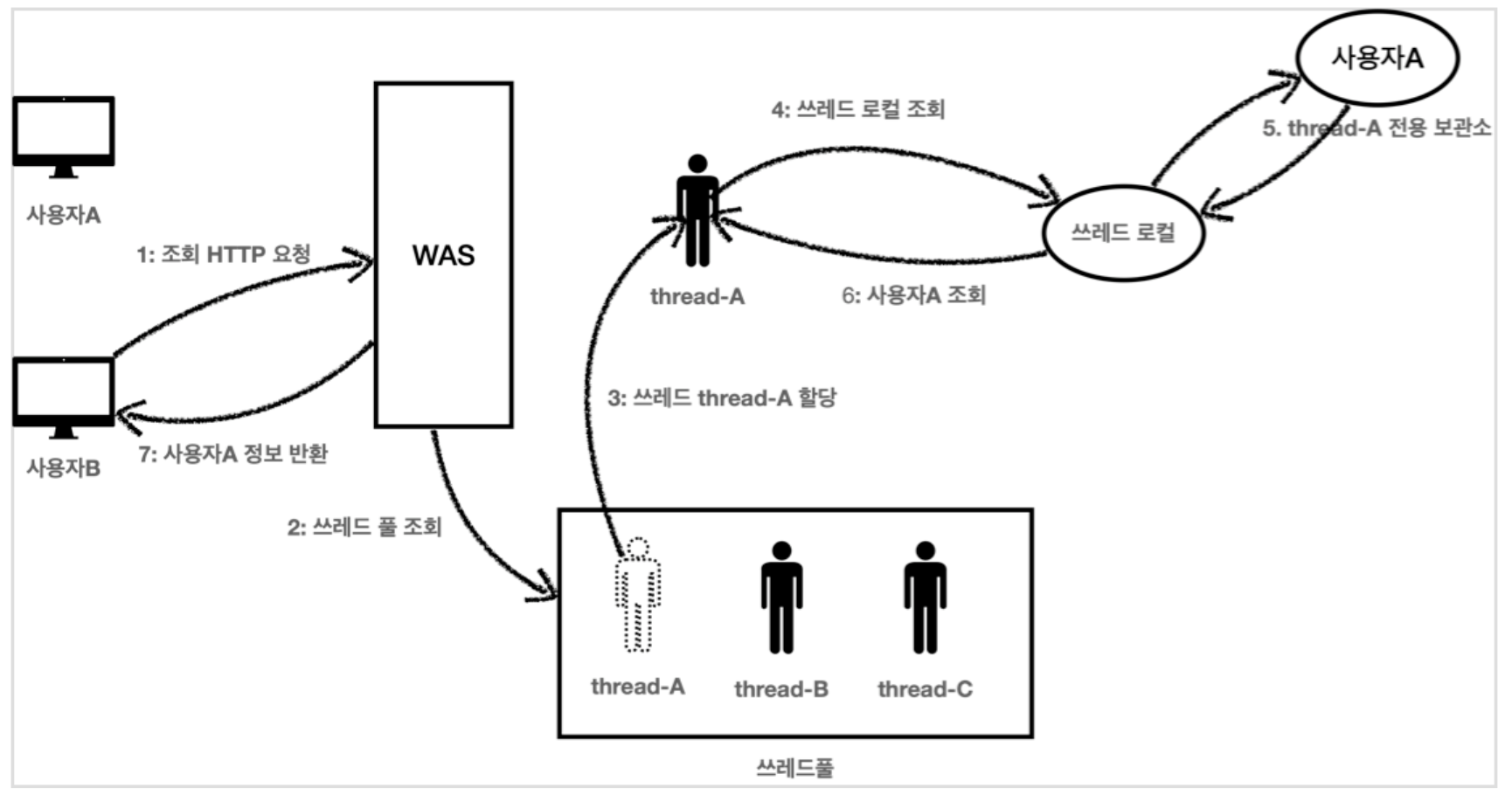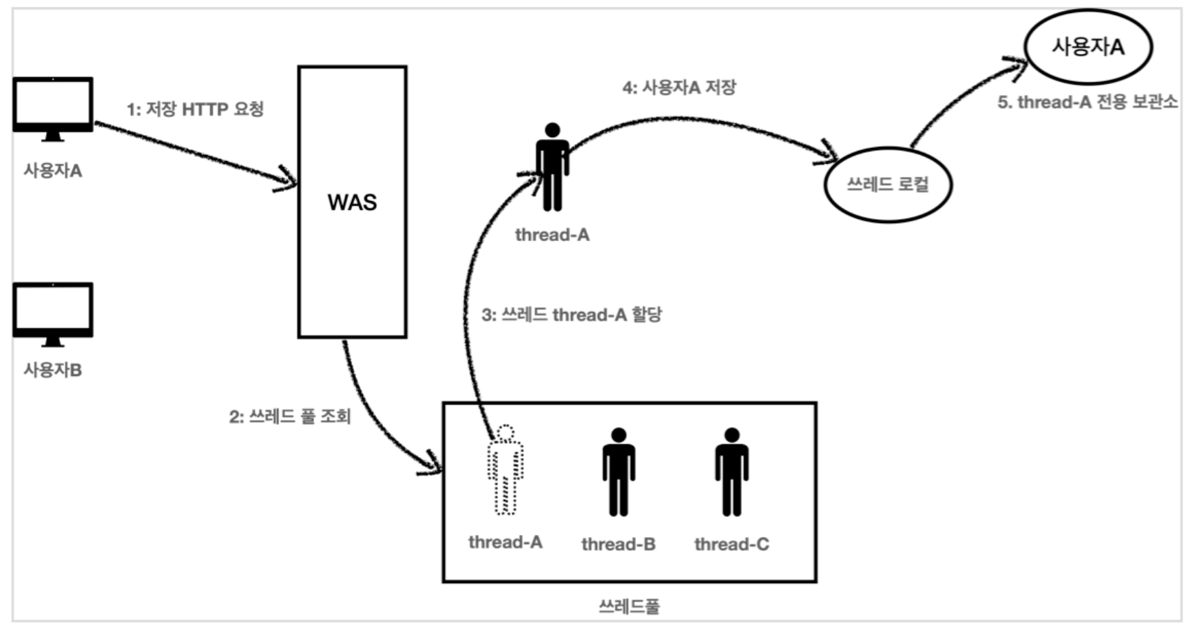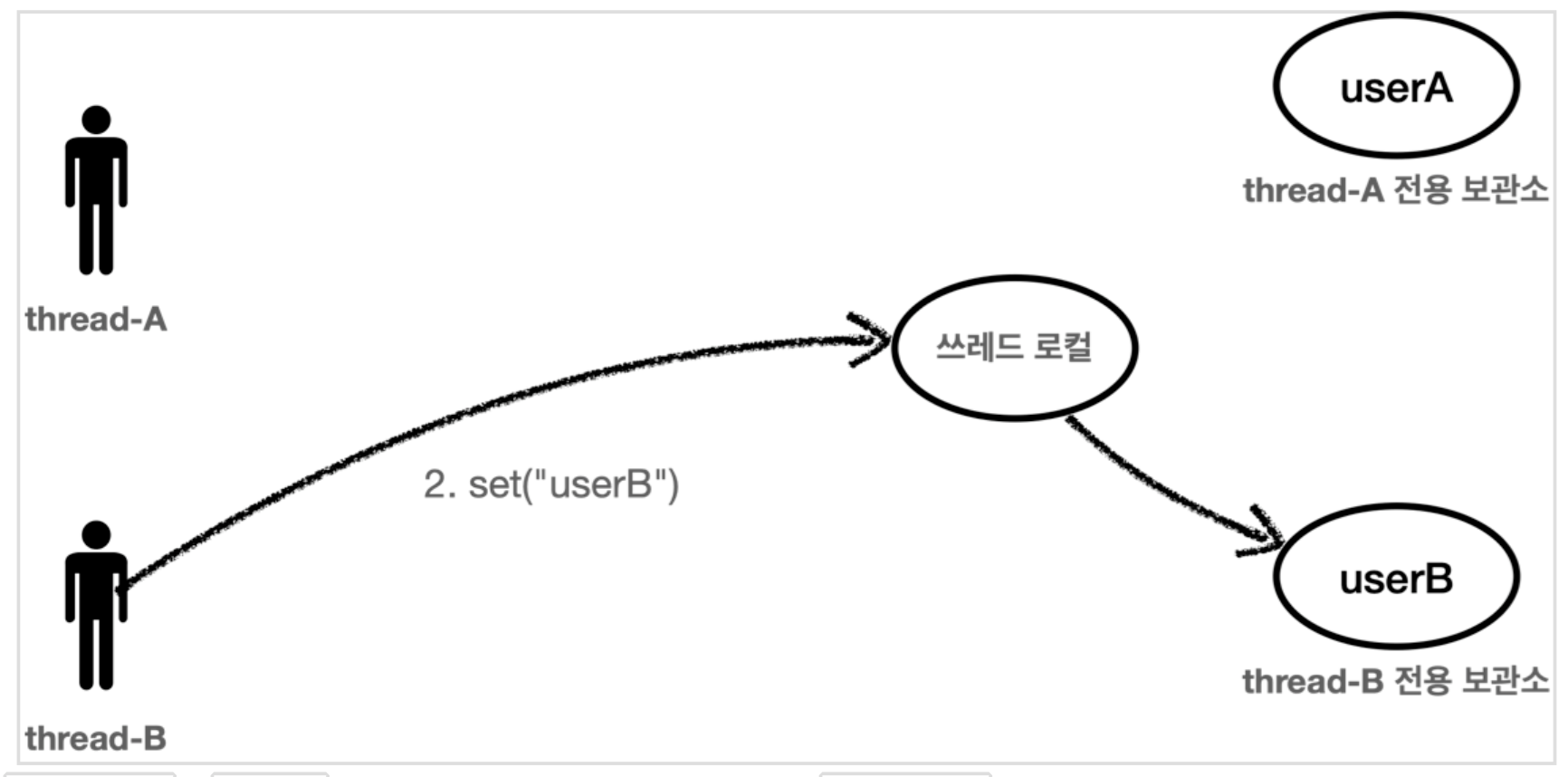 ThreadLocal은 해당 쓰레드만이 접근할 수 있는 저장소를 말한다.